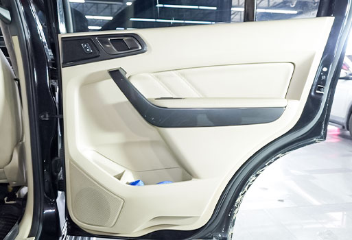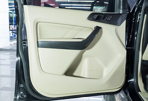 ติดตั้งลำโพงกับแดมป์ที่ประตูหน้ารถยนต์ FORD EVERESTเสร็จเรียบร้อยคงสภาพเหมือนเดิม